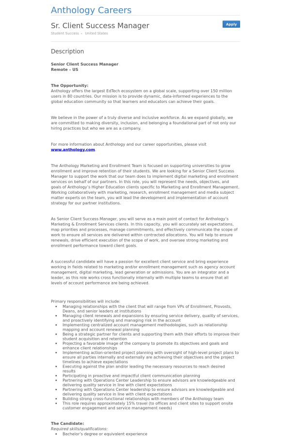 Senior Client Success Manager Job At Blackboard In United States 56941432 Tapwage Job Search